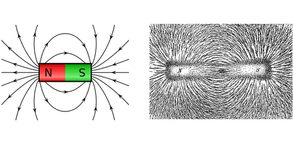 We can physically see this with iron fillings scattered over a real magnet (on the right). The magnetic field acts on them and arranges them in a way that we can actually see the field lines!