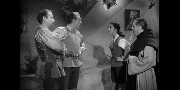 Each member of the trio has a different reason for embarking on this quest: Don Pedro de Rivera (Romero) is the rightful owner of the castle and seeks to take back his home, Juan Ponce de León (Tito Junco) wants to steal a rare gem owned by the Caliph that supposedly holds the key to eternal youth, and Lolita (the effervescent Jurado) wants the castle’s alchemist to give her the secret to producing gold so she can finally live in luxury. The three adventurers, all of whom are a keen hand with a sword, are aided in their quest by the castle’s resident friar, Padre Angélico (Miguel Ángel Ferriz). However, in their attempt to invade the castle, they also find themselves tangled up in the misfortunes of a princess (Rebeca Iturbide) who is set to be forced into marriage to an evil man.